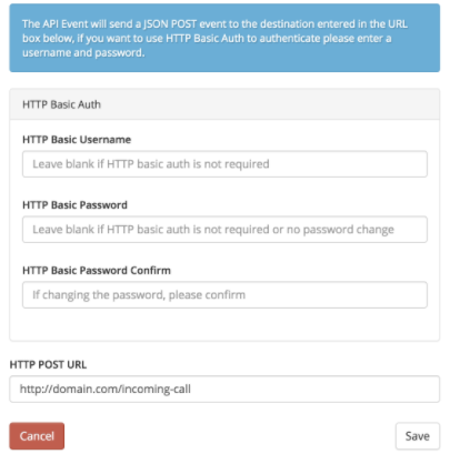API Events are used to be able to send a POST event to a designated end point. At this point Incoming Call is the only option available however, others may be added in the future.